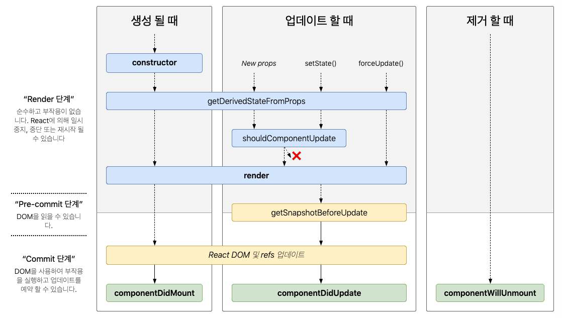 - 생명주기 메소드는 React의 클래스형 컴포넌트에서만 사용할 수 있습니다.
